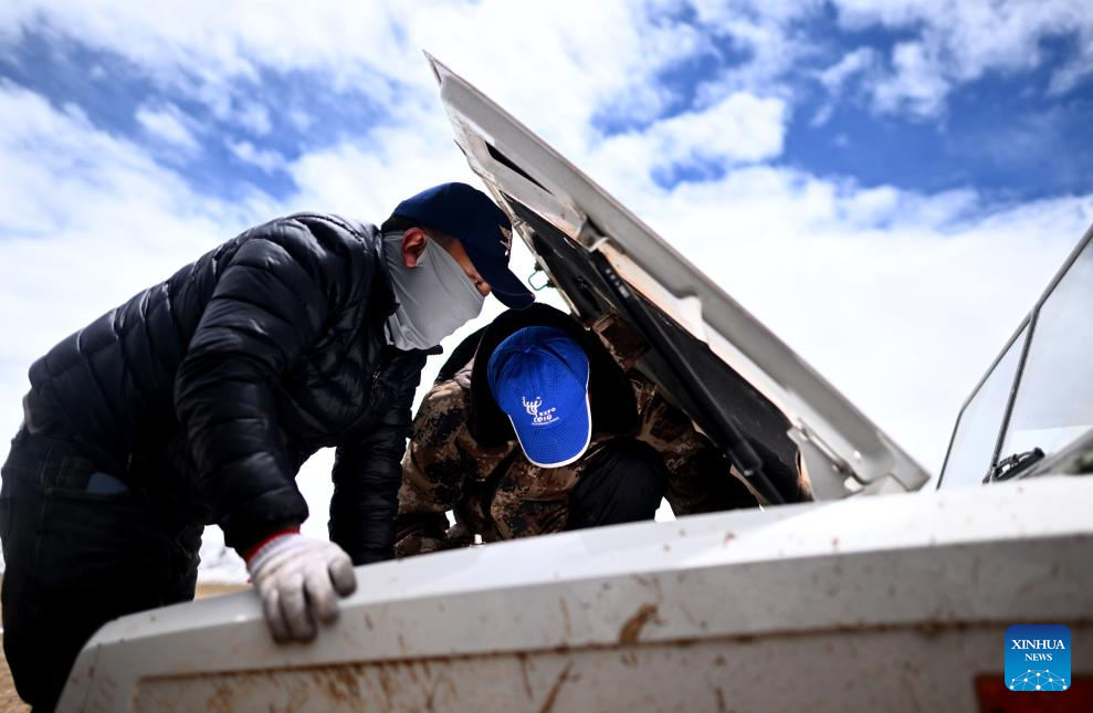 Tsesogyal (L), a staffer with the Drolkar Lake protection station, and his colleague repair a vehicle on their way to the Drolkar Lake protection station in Hoh Xil, northwest China's Qinghai Province, June 16, 2023. (Xinhua/Zhang Hongxiang)