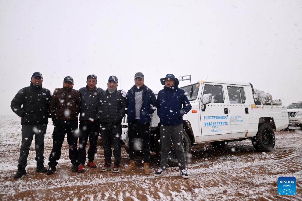 Staffers with the Drolkar Lake protection station of the Hoh Xil management office pose for group photos in Hoh Xil, northwest China's Qinghai Province, June 16, 2023. (Xinhua/Zhang Hongxiang)?