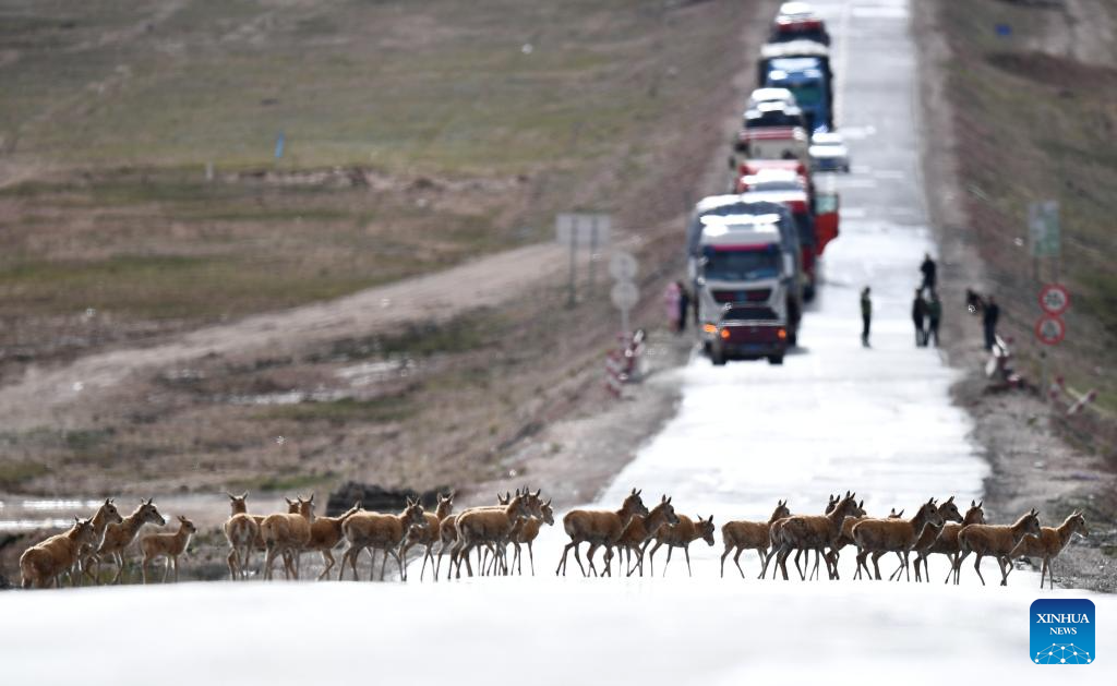 A group of Tibetan antelopes pass through the Qinghai-Tibet Highway and head towards the Sanjiangyuan area in northwest China's Qinghai Province, July 28, 2023. (Xinhua/Zhang Hongxiang)