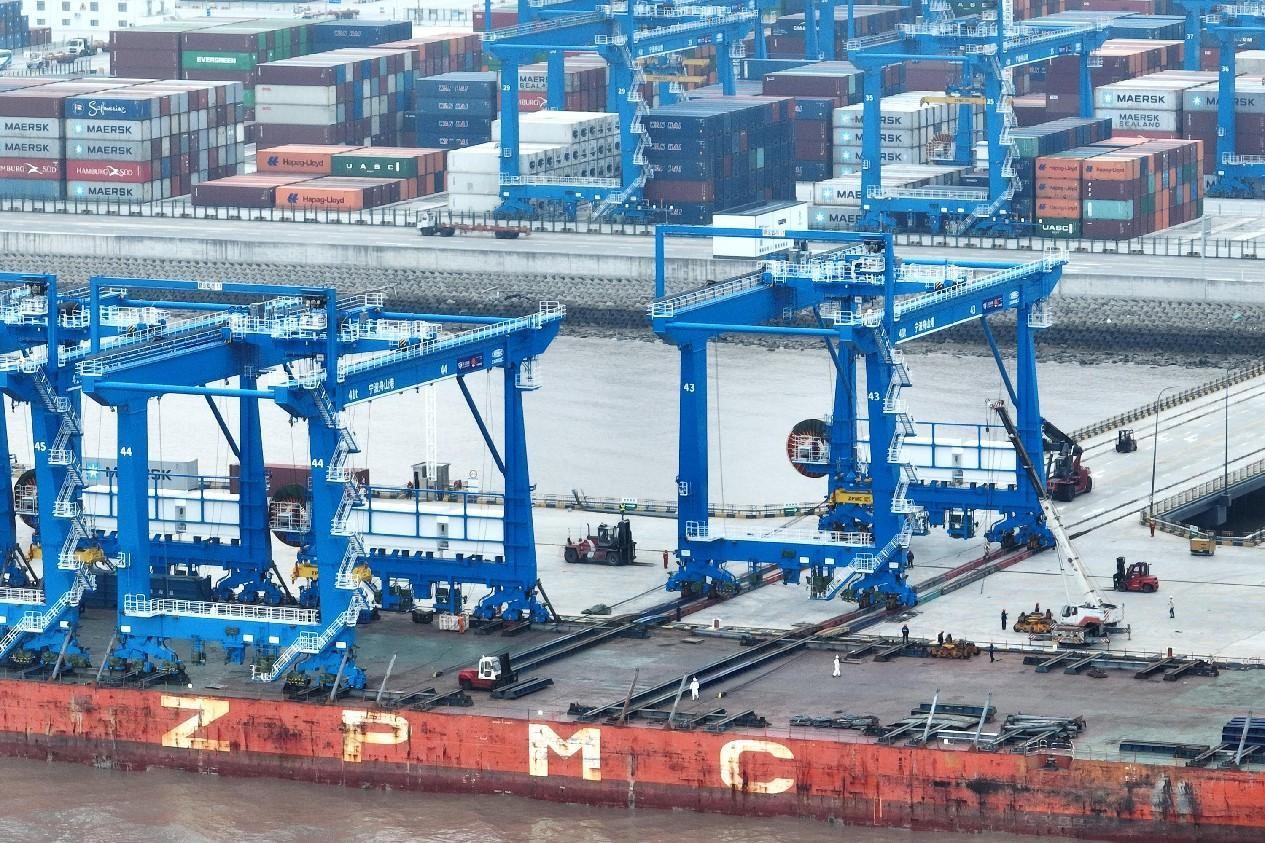 The terminal in the Meishan port area of Ningbo-Zhoushan Port has significantly improved operational efficiency through intelligent facilities, such as unmanned container trucks and remotely controlled automated gantry cranes and bridge cranes.