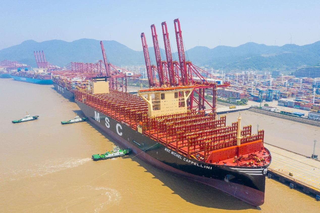 Ultra-large container ship MSC Michel Cappellini sails slowly into a berth with the help of tugboats at the container terminal of the Chuanshan port area of Ningbo-Zhoushan Port in east China's Zhejiang province, June 2, 2023. (People's Daily Online/Jiang Xiaodong)