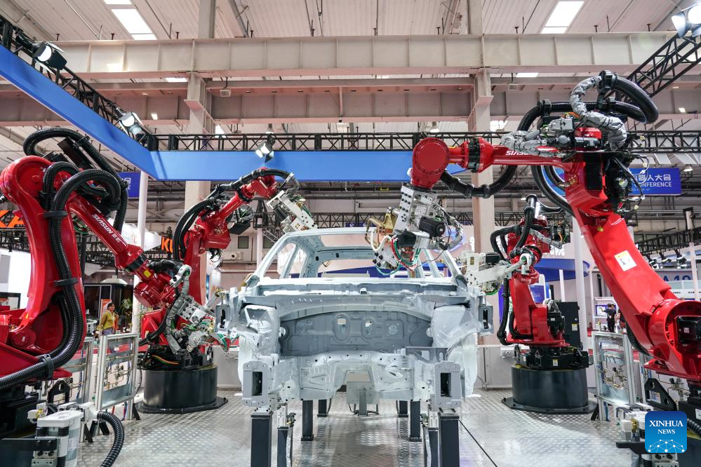 Welding robots are pictured at the World Robot Conference 2023 in Beijing, capital of China, Aug. 16, 2023. The World Robot Conference 2023 opened here Wednesday, showcasing cutting-edge achievements and the latest robot industry exhibits. (Xinhua/Peng Ziyang)