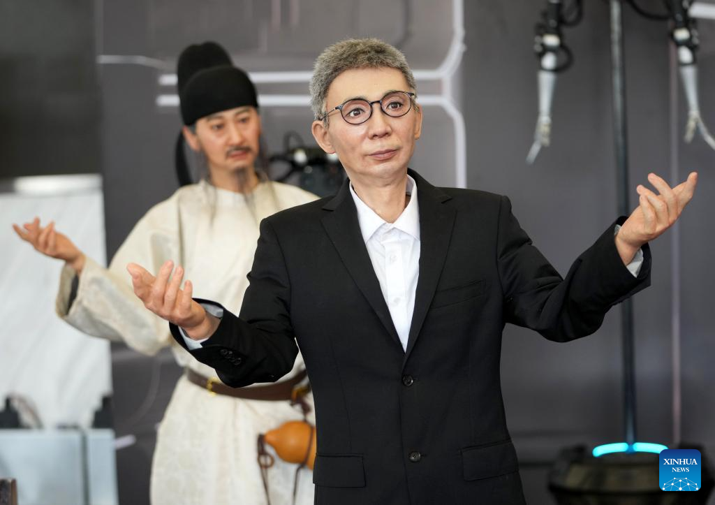 A humanoid robot resembling ancient Chinese poet Li Bai performs at the World Robot Conference 2023 in Beijing, capital of China, Aug. 16, 2023. The World Robot Conference 2023 opened here Wednesday, showcasing cutting-edge achievements and the latest robot industry exhibits. (Xinhua/Wang Yuguo)