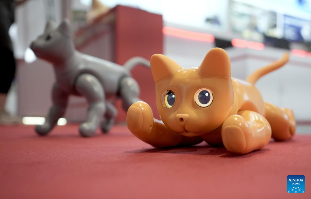 Robotic cats are pictured at the World Robot Conference 2023 in Beijing, capital of China, Aug. 16, 2023. The World Robot Conference 2023 opened here Wednesday, showcasing cutting-edge achievements and the latest robot industry exhibits. (Xinhua/Wang Yuguo)
