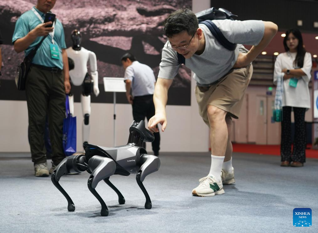 A visitor interacts with a robotic dog at the World Robot Conference 2023 in Beijing, capital of China, Aug. 16, 2023. The World Robot Conference 2023 opened here Wednesday, showcasing cutting-edge achievements and the latest robot industry exhibits. (Xinhua/Ren Chao)