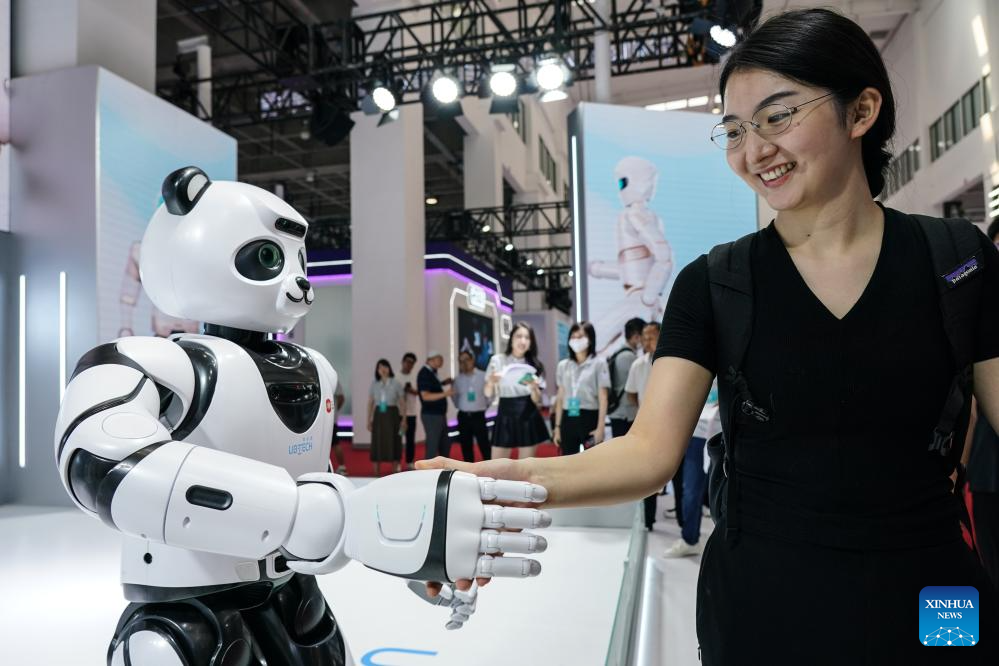 A visitor interacts with a humanoid robot at the World Robot Conference 2023 in Beijing, capital of China, Aug. 16, 2023. The World Robot Conference 2023 opened here Wednesday, showcasing cutting-edge achievements and the latest robot industry exhibits. (Xinhua/Peng Ziyang)