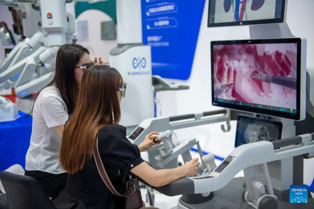 Visitors try out a surgery robot at the World Robot Conference 2023 in Beijing, capital of China, Aug. 16, 2023. The World Robot Conference 2023 opened here Wednesday, showcasing cutting-edge achievements and the latest robot industry exhibits. (Xinhua/Xu Jiayi)