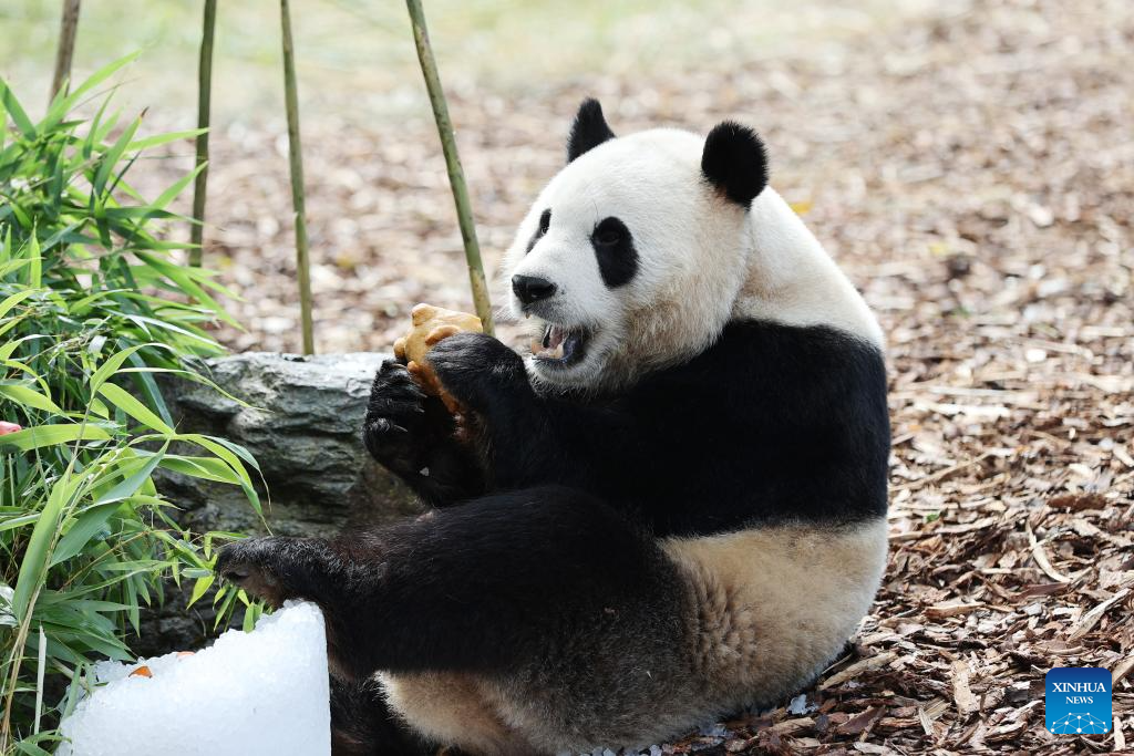 Giant panda Bao Mei has birthday meal at the Pairi Daiza zoo in Brugelette, Belgium, on Aug. 16, 2023. The celebration of the fourth birthday of the panda twins Bao Di and Bao Mei, born on Aug. 8, 2019, was held at the Pairi Daiza zoo on Wednesday. (Xinhua/Zhao Dingzhe)