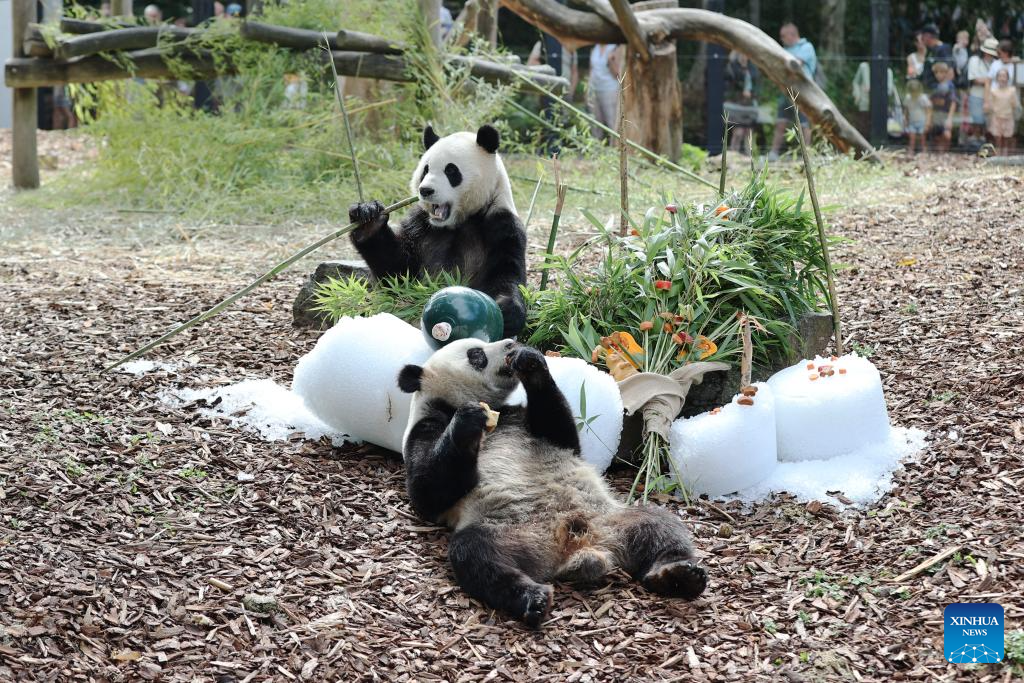 Giant panda twins Bao Di (rear) and Bao Mei have birthday meal at the Pairi Daiza zoo in Brugelette, Belgium, on Aug. 16, 2023. The celebration of the fourth birthday of the panda twins Bao Di and Bao Mei, born on Aug. 8, 2019, was held at the Pairi Daiza zoo on Wednesday. (Xinhua/Zhao Dingzhe)