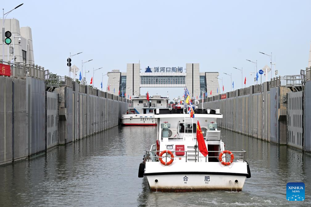 Ships wait in line to pass through the Paihekou ship lock of a mega water diversion project in east China's Anhui Province, Aug. 16, 2023. An essential section of the shipping route on the mega water diversion project started trial operation on Wednesday. The project aims to divert water from the Yangtze, China's longest river, to the Huaihe River. (Xinhua/Huang Bohan)