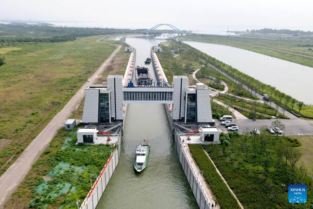 This aerial photo taken on Aug. 16, 2023 shows ships sailing on a new shipping route of a mega water diversion project in east China's Anhui Province. An essential section of the shipping route on the mega water diversion project started trial operation on Wednesday. The project aims to divert water from the Yangtze, China's longest river, to the Huaihe River. (Xinhua/Huang Bohan)
