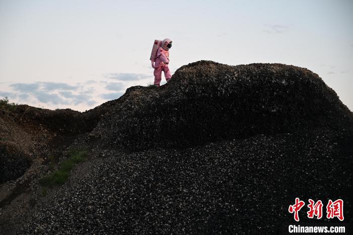 Photo shows a tourist dressed in a "space suit" at the Ulan Hada volcano group in Ulanqab city, north China's Inner Mongolia Autonomous Region. (Chinanews.com/Liu Wenhua)