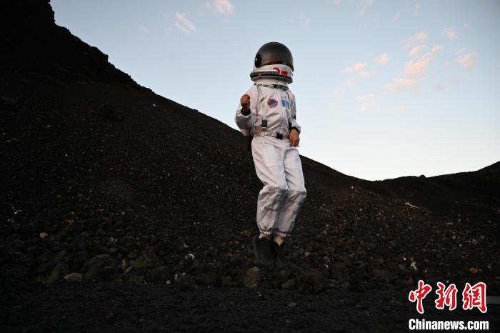 Photo shows a child dressed in a "space suit" at the Ulan Hada volcano group in Ulanqab city, north China's Inner Mongolia Autonomous Region. (Chinanews.com/Liu Wenhua)