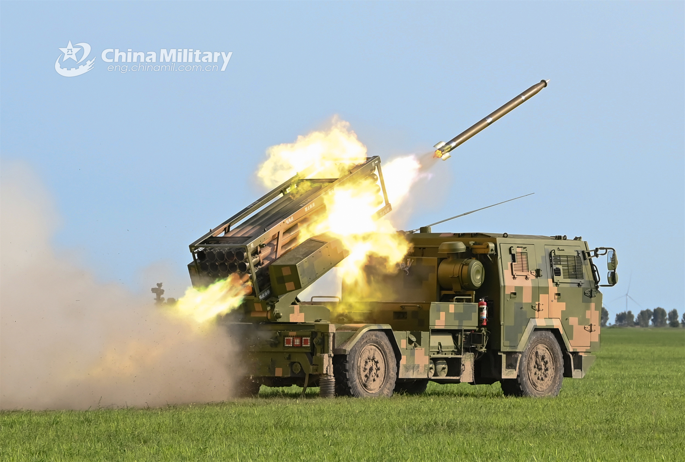 A long-range multiple rocket launcher system (MRLS) attached to a brigade under the PLA 78th Group Army fires at mock targets during a live-fire training exercise in late July, 2023. (eng.chinamil.com.cn/Photo by Liu Yishan)