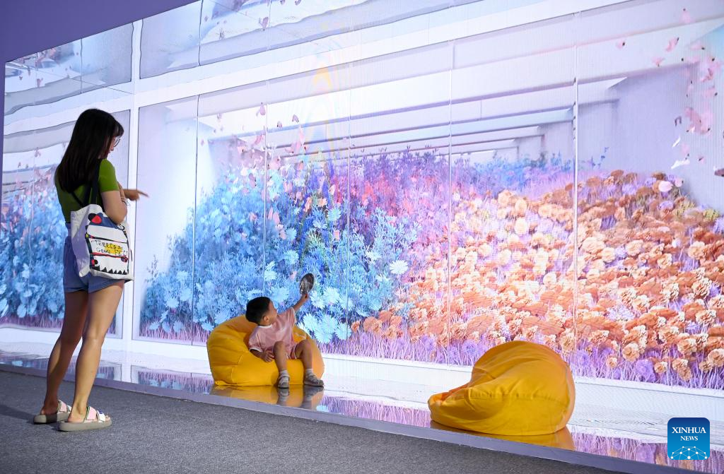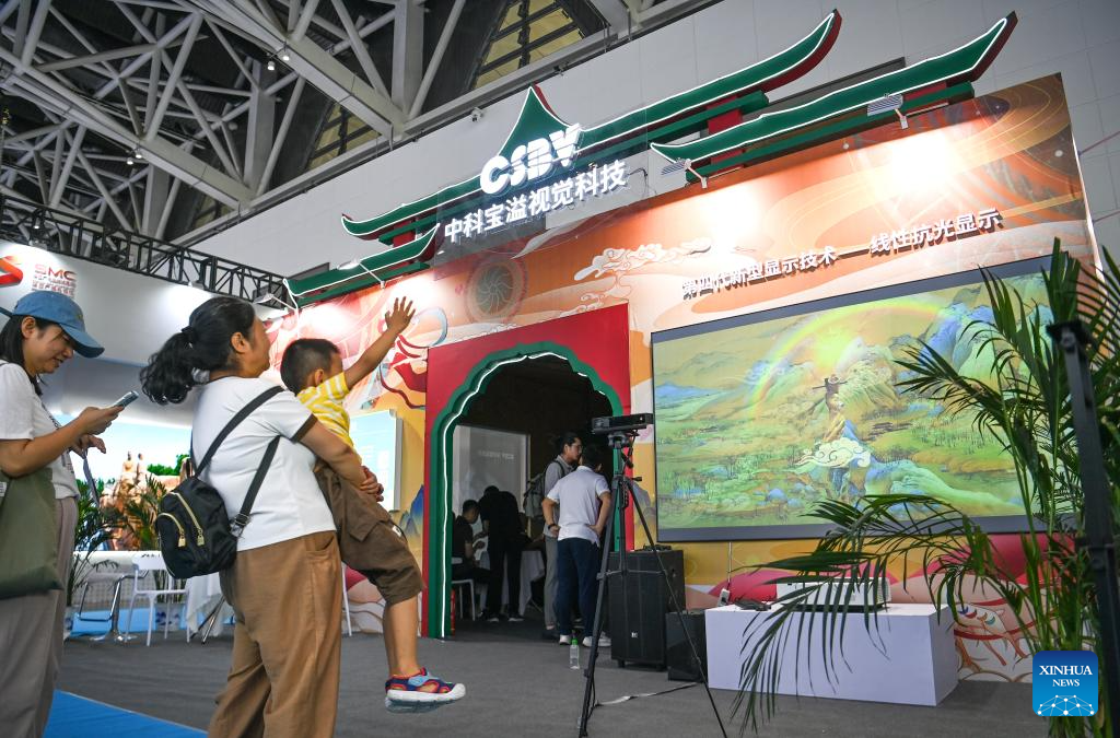 Visitors visit the digital culture exhibition area at the 10th West China Culture Industries Expo in Xi'an, northwest China's Shaanxi Province, Aug. 18, 2023. The 10th West China Culture Industries Expo opened on Thursday in Xi'an and will last till Aug. 20. The digital culture exhibition area of the expo features the latest achievements in the application of digital technology in the cultural industry, providing immersive experience of digital culture for the visitors. (Xinhua/Zou Jingyi)