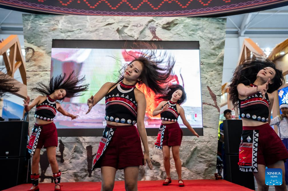 Artists perform in the Culture and Tourism Pavilion at the seventh China-South Asia Expo in Kunming, southwest China's Yunnan Province, Aug. 19, 2023. The ongoing seventh China-South Asia Expo has attracted more than 30,000 exhibitors, representatives, and guests from 85 countries and regions to attend online and offline. (Xinhua/Hu Chao)