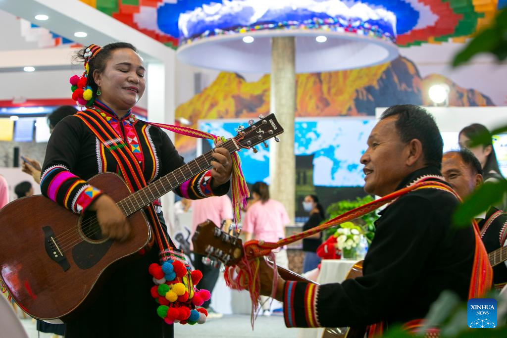 Artists perform traditional songs in the Culture and Tourism Pavilion at the seventh China-South Asia Expo in Kunming, southwest China's Yunnan Province, Aug. 18, 2023. The ongoing seventh China-South Asia Expo has attracted more than 30,000 exhibitors, representatives, and guests from 85 countries and regions to attend online and offline. (Xinhua/Cui Wen)