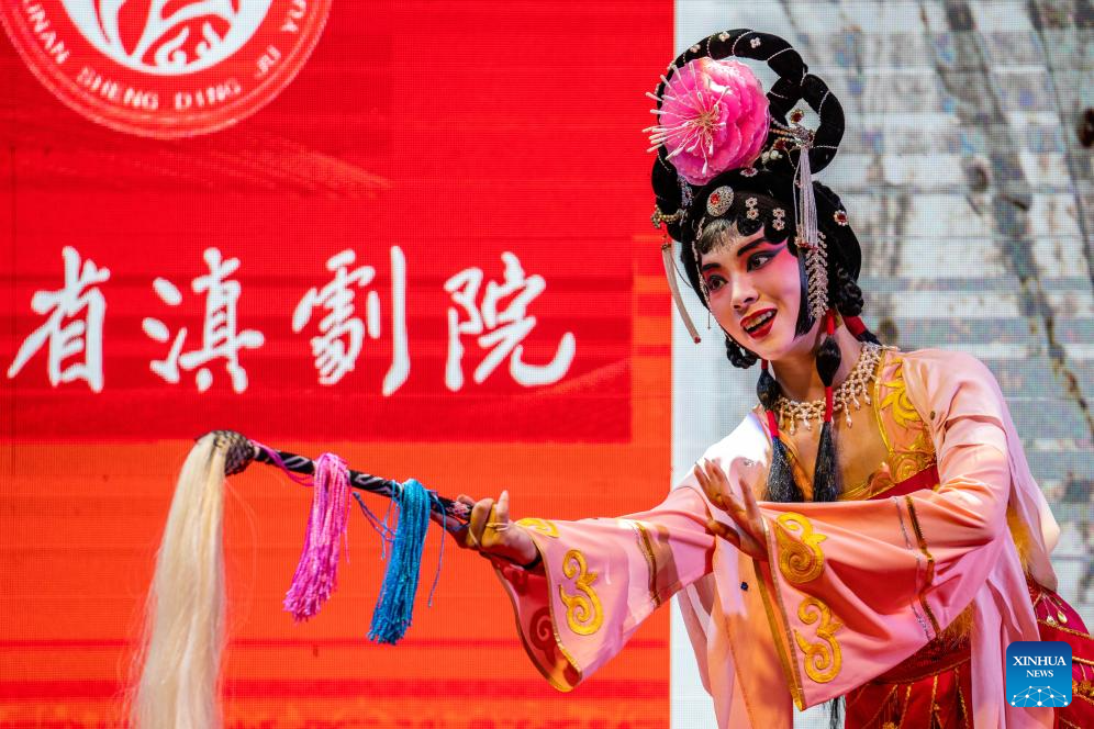 An artist performs in the Culture and Tourism Pavilion at the seventh China-South Asia Expo in Kunming, southwest China's Yunnan Province, Aug. 19, 2023. The ongoing seventh China-South Asia Expo has attracted more than 30,000 exhibitors, representatives, and guests from 85 countries and regions to attend online and offline. (Xinhua/Hu Chao)
