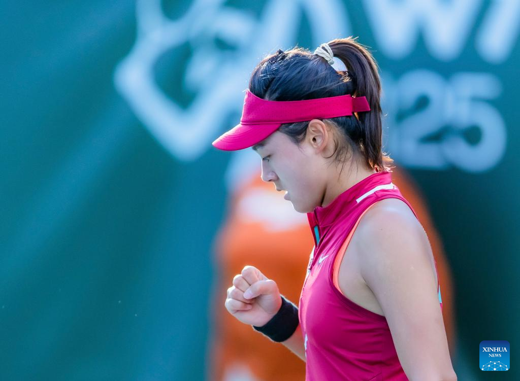 Wang Yafan celebrates scoring during the women's singles semifinal match between Wang Yafan of China and Uchijima Moyuka of Japan at the Golden Gate Open tennis tournament in San Francisco Bay Area, the United States, on Aug. 18, 2023. (Photo by Arthur Dong/Xinhua)