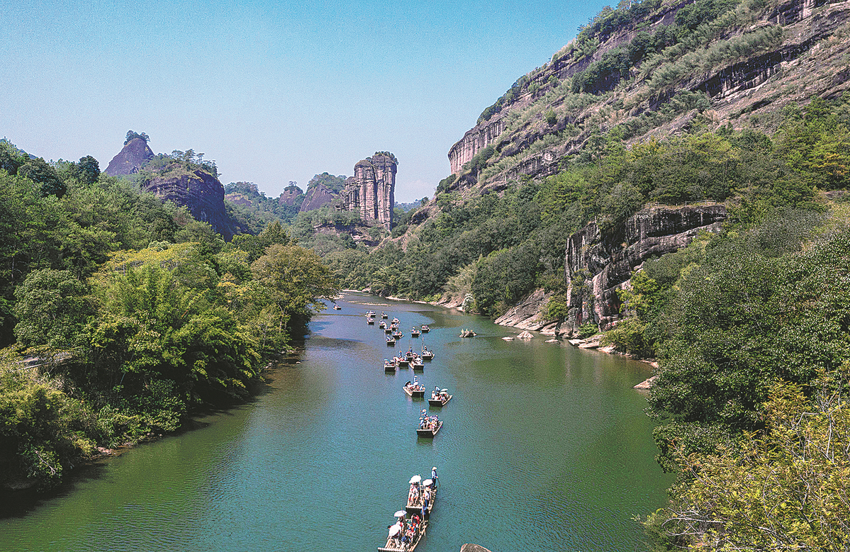 Visitors are led by guides in boats along a section of the Jiuqu Creek in Wuyishan National Park in Fujian province last month. [Photo/Xinhua]