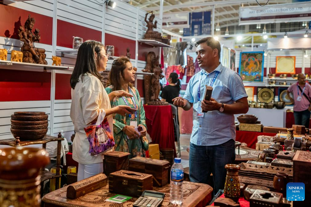 An exhibitor (R) introduces products at the booth of Nepal at the 7th China-South Asia Expo in Kunming, southwest China's Yunnan Province, Aug. 18, 2023. The ongoing seventh China-South Asia Expo has attracted more than 30,000 exhibitors, representatives, and guests from 85 countries and regions to attend online and offline. (Xinhua/Hu Chao)