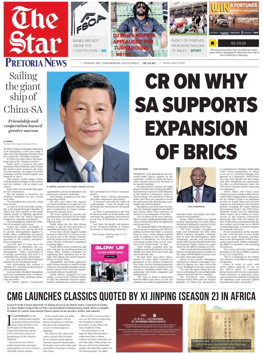 Xi made the remarks in an article that he wrote for South African media, which was published on Monday, as he started a state visit to the nation and is due to attend the 15th BRICS Summit to be held in Johannesburg from Tuesday to Thursday.