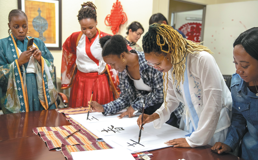 Students attempt Chinese calligraphy at the Confucius Institute in Johannesburg, South Africa, during a United Nations Chinese Language Day event on April 19. ZHANG YUDONG / XINHUA