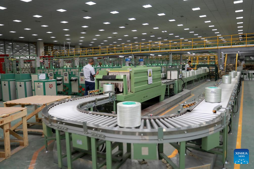 Workers operate on the fiberglass production line of Jushi Egypt Fiberglass Co., Ltd. at the China-Egypt TEDA Suez Economic and Trade Cooperation Zone in Suez province, Egypt, Aug. 10, 2023. (Xinhua/Sui Xiankai)