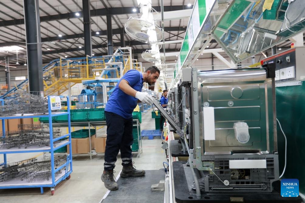 Workers work on the dishwasher production line of Midea (Egypt) Kitchen &Water Heater Appliances Co., Ltd. at the China-Egypt TEDA Suez Economic and Trade Cooperation Zone in Suez province, Egypt, Aug. 10, 2023. (Xinhua/Sui Xiankai)