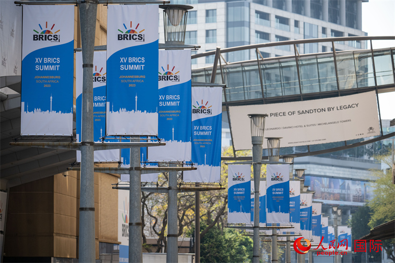Photo taken on Aug. 21, 2023 shows banners for the 15th BRICS Summit, which is slated to run from Aug. 22 to 24 in Johannesburg, South Africa. Chinese President Xi Jinping arrived in South Africa on Monday to attend the 15th BRICS Summit and pay a state visit to South Africa. (People's Daily Online/Weng Qiyu)