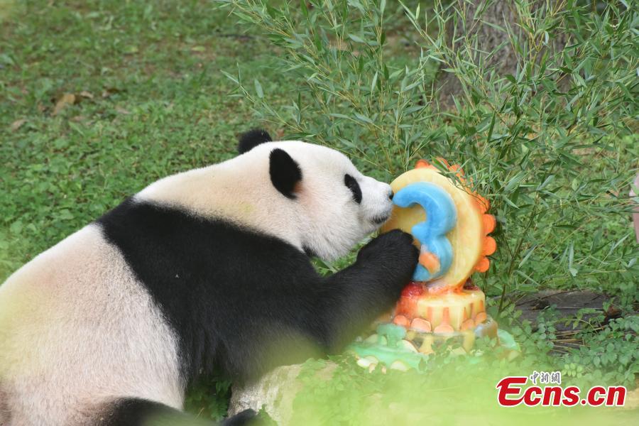 Giant panda cub Xiao Qi Ji celebrates its 3rd birthday with an ice cake at Smithsonian's National Zoo in Washington, D.C., the United States, Aug. 21, 2023. (Photo: China News Service/Sha Hanting)