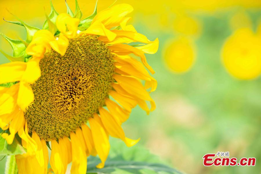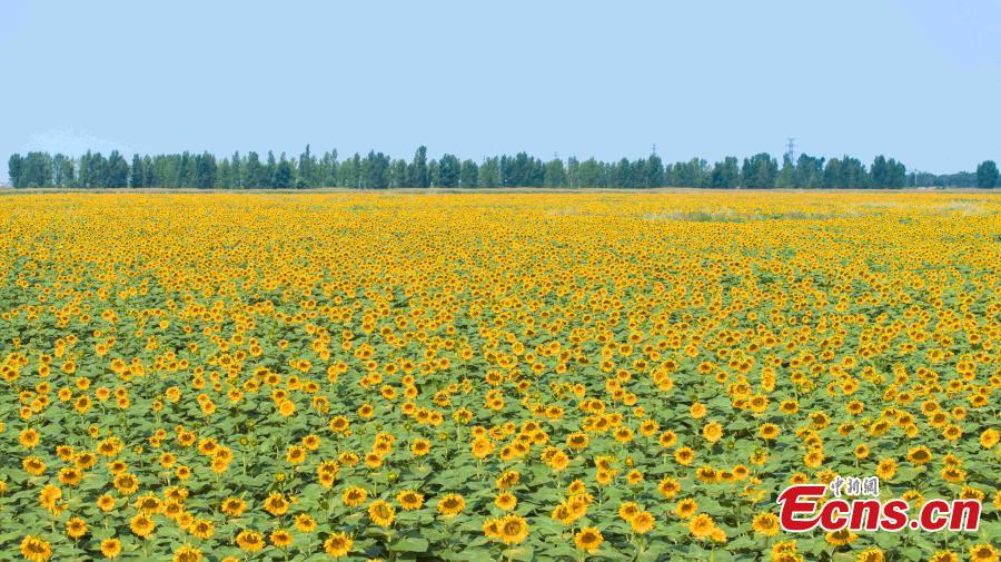 Blooming sunflowers facing the sun sway in the breeze in Togtoh County, north China's Inner Mongolia Autonomous Region. (Photo/China News Service)