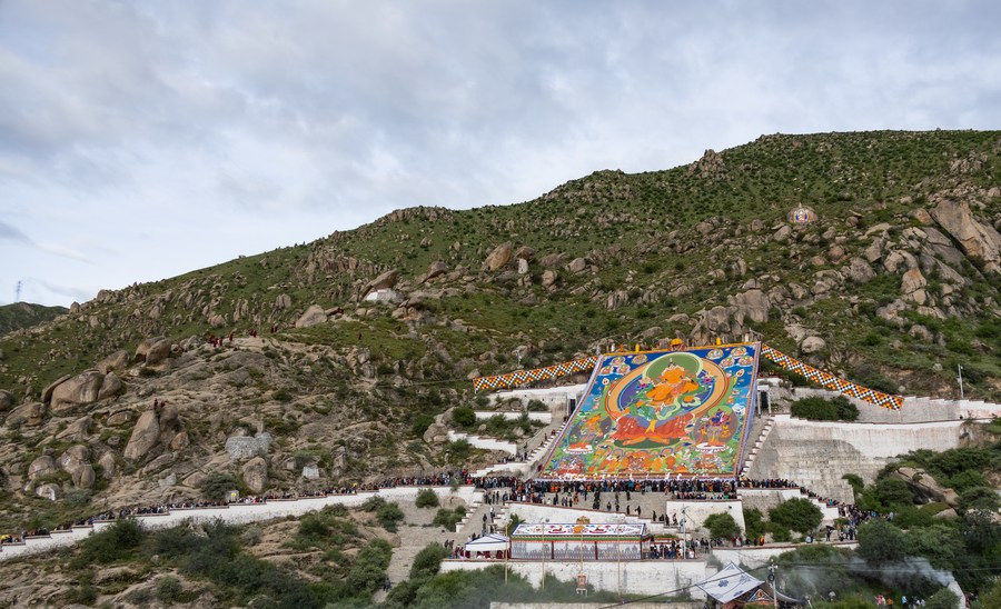 This photo taken on Aug. 16, 2023 shows a huge Thangka painting during the "sunning of the Buddha" ceremony at the Drepung Monastery in Lhasa, southwest China's Tibet Autonomous Region. (Photo by Tenzin Nyida/Xinhua)
