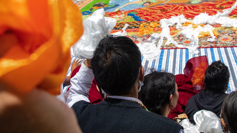 People throw hadas, or silk scarves used by Tibetans to express respect and greeting, at a huge Thangka painting during the "sunning of the Buddha" ceremony at the Drepung Monastery in Lhasa, southwest China's Tibet Autonomous Region, Aug. 16, 2023. (Photo by He Bingjie/Xinhua)