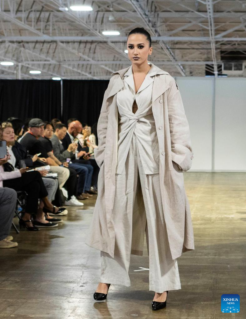 A model presents a creation during a Chinese brands fashion show at the 2023 Apparel Textile Sourcing Trade Show in Toronto, Canada, on Aug. 22, 2023. (Photo by Zou Zheng/Xinhua)