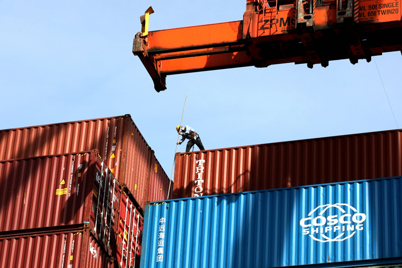 A worker handles containers at Yangpu Port in south China's Hainan Province. (People's Daily Online/Fu Wuping)