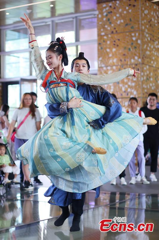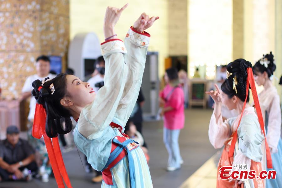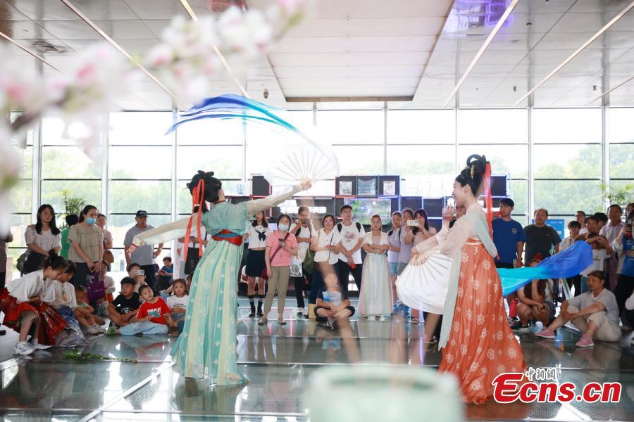 Artists in traditional Chinese costumes dance to present folk customs of Qixi Festival in a museum at the Grand Baoen Temple Heritage and Scenic Area in Nanjing, east China's Jiangsu Province, Aug. 22, 2023. (Photo: China News Service/Yang Bo)