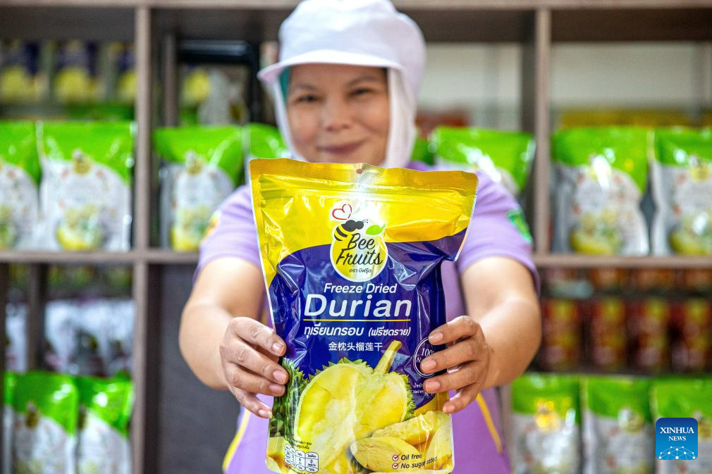 A staff member shows freeze-dried durian products at a fruit products company in Chanthaburi Province, Thailand, Aug. 17, 2023. (Xinhua/Wang Teng)