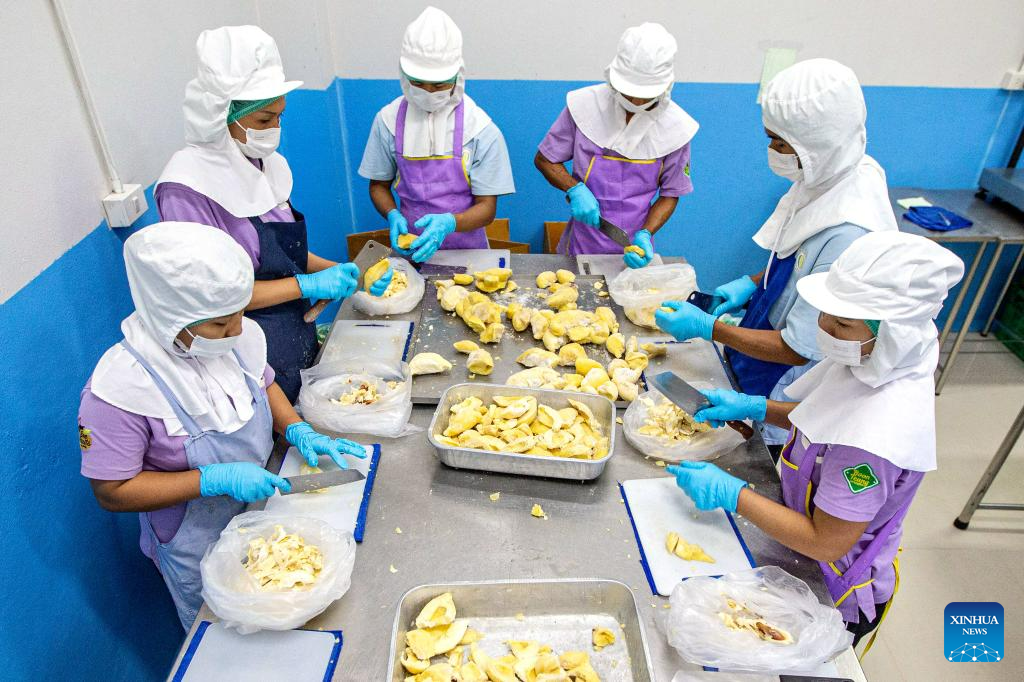 Staff members cut durian pulps at a fruit products company in Chanthaburi Province, Thailand, Aug. 17, 2023. (Xinhua/Wang Teng)