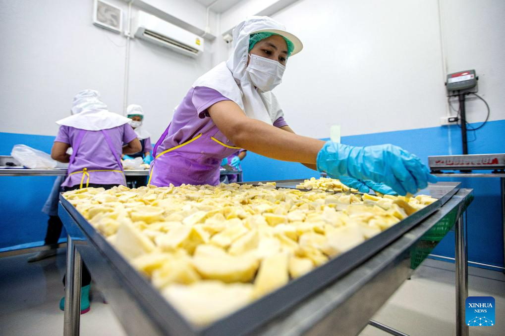 A staff member checks freeze-dried durian products at a fruit products company in Chanthaburi Province, Thailand, Aug. 17, 2023. (Xinhua/Wang Teng)
