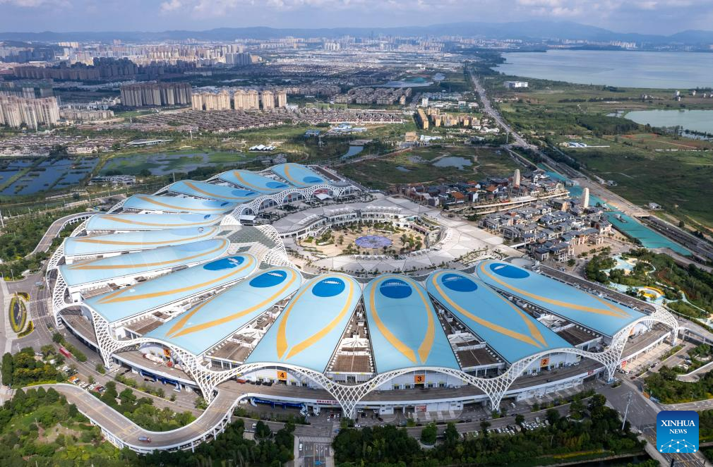 This aerial photo taken on Aug. 8, 2023 shows a view of Kunming Dianchi International Convention and Exhibition Center, the venue for the seventh China-South Asia Expo in Kunming, southwest China's Yunnan Province. (Xinhua/Chen Xinbo)