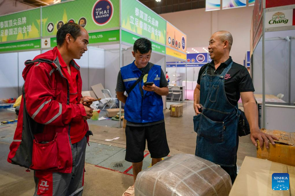This photo taken on Aug. 20, 2023 shows Chen Jie (R) talking with express delivery staff after the seventh China-South Asia Expo closed in Kunming, southwest China's Yunnan Province. (Xinhua/Chen Xinbo)