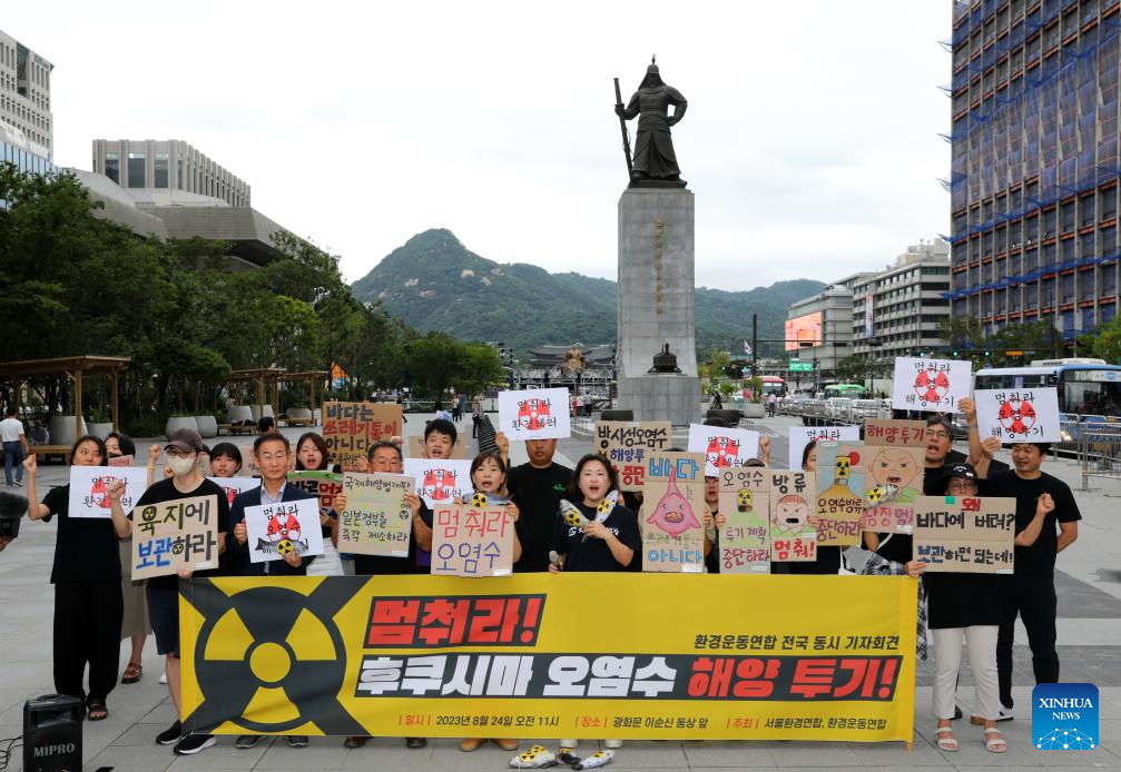 SEOUL, Aug. 24 (Xinhua) -- Lawmakers of the South Korean main opposition Democratic Party on Thursday protested against Japan's discharge of nuclear-contaminated wastewater into the ocean, pushing for bills to legislate the right to indemnity claims against the Japanese government.