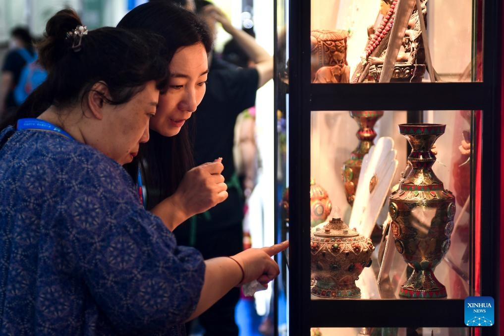 Visitors buy products from Nepal at the 14th China-Northeast Asia Expo in Changchun, the capital city of northeast China's Jilin Province, Aug. 24, 2023. The 14th China-Northeast Asia Expo opened Wednesday in Changchun. The five-day event, scheduled both online and offline, has attracted more than 1,000 companies from home and abroad, with a predominant representation from countries in Northeast Asia. (Xinhua/Xu Chang)