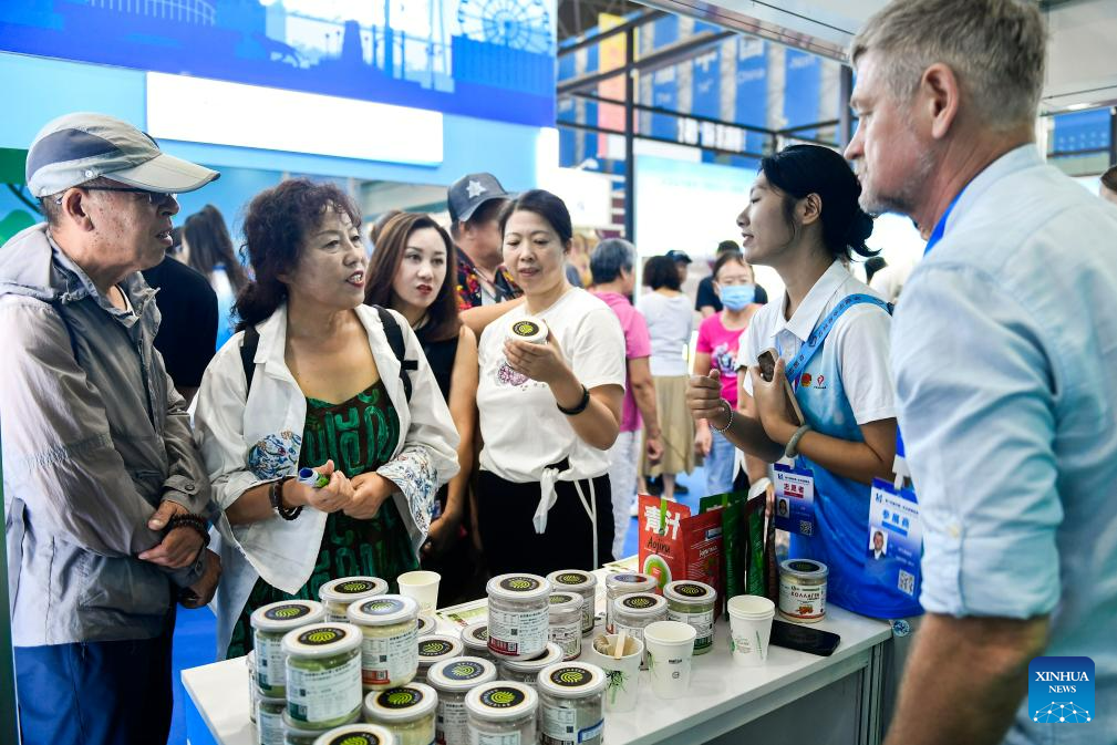 Visitors shop at the 14th China-Northeast Asia Expo in Changchun, the capital city of northeast China's Jilin Province, Aug. 24, 2023. The 14th China-Northeast Asia Expo opened Wednesday in Changchun. The five-day event, scheduled both online and offline, has attracted more than 1,000 companies from home and abroad, with a predominant representation from countries in Northeast Asia. (Xinhua/Xu Chang)