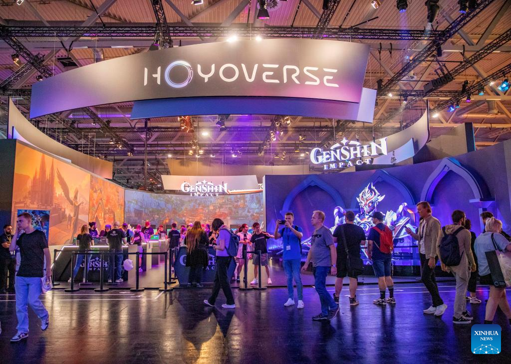 People visit the booth of miHoYo during gamescom 2023 in Cologne, Germany, Aug. 23, 2023. (Xinhua/Zhang Fan)