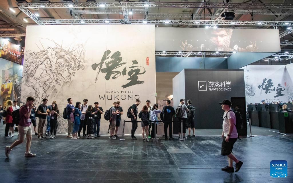 People try games at the booth of game science during gamescom 2023 in Cologne, Germany, Aug. 23, 2023. (Xinhua/Zhang Fan)