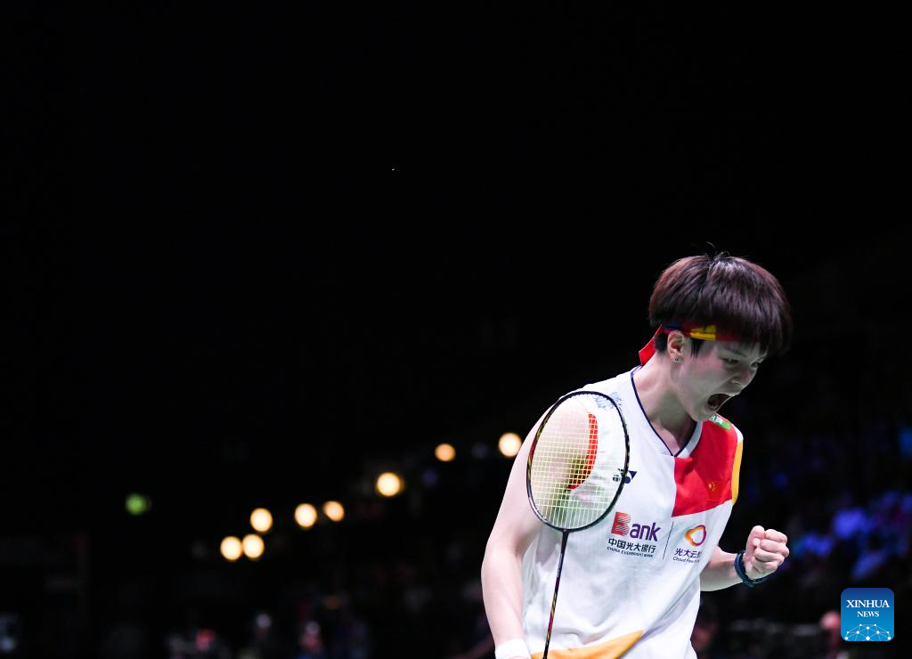 Chen Yufei of China celebrates after the women's singles round of 16 match against Mia Blichfeldt of Denmark at the BWF World Championships 2023 in Copenhagen, Denmark, Aug. 24, 2023. (Xinhua/Ren Pengfei)