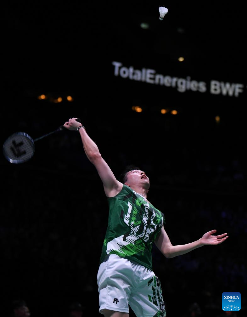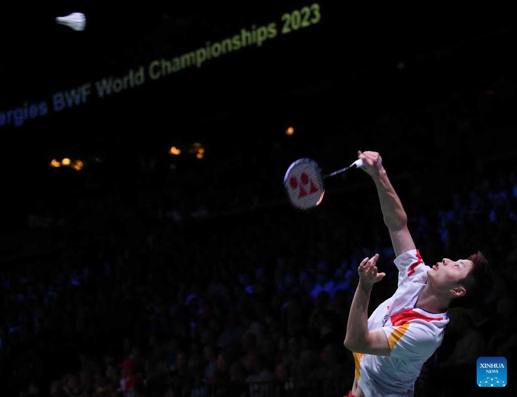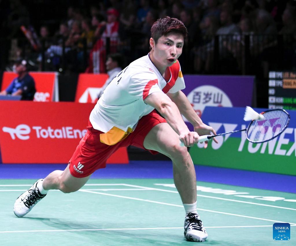 Shi Yuqi of China hits a return during the men's singles round of 16 match against Ng Ka Long Angus of China's Hong Kong at the BWF World Championships 2023 in Copenhagen, Denmark, Aug. 24, 2023. (Xinhua/Ren Pengfei)