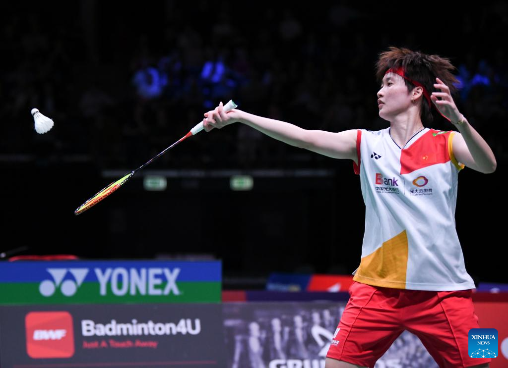 Wang Zhiyi of China hits a return during the women's singles round of 16 match against He Bingjiao of China at the BWF World Championships 2023 in Copenhagen, Denmark, Aug. 24, 2023. (Xinhua/Ren Pengfei)